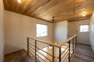 2階ホールは吹抜で、とても明るく気持ちのいい空間に。お洗濯を干せばすぐ乾く人気のスペース。