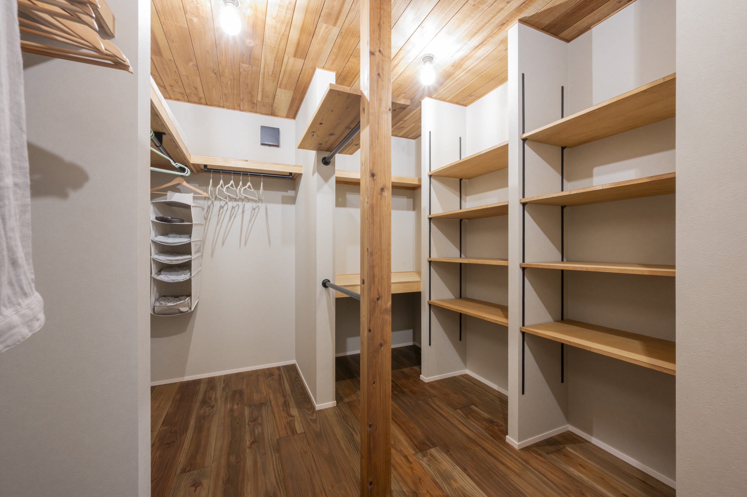 2階に家族みんなで使えるウォークインクローゼット。たっぷりと収納できるから、リビングや寝室がすっきり片付く。