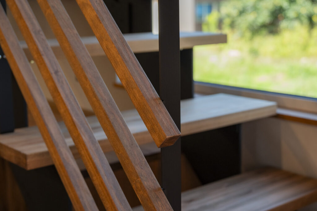 県産材サンポクシダーの自然な木目を活かした階段は、長く住まう程に深みのある色合いへと変化していきます。 -