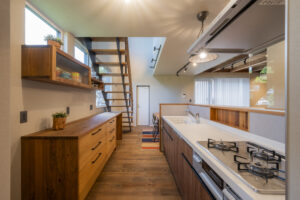 広々使えるキッチンスペース。自然な木目が美しい戸棚とカップボ-ドはHWHオリジナル。自社工場でひとつひとつ丁寧に職人が造っています。