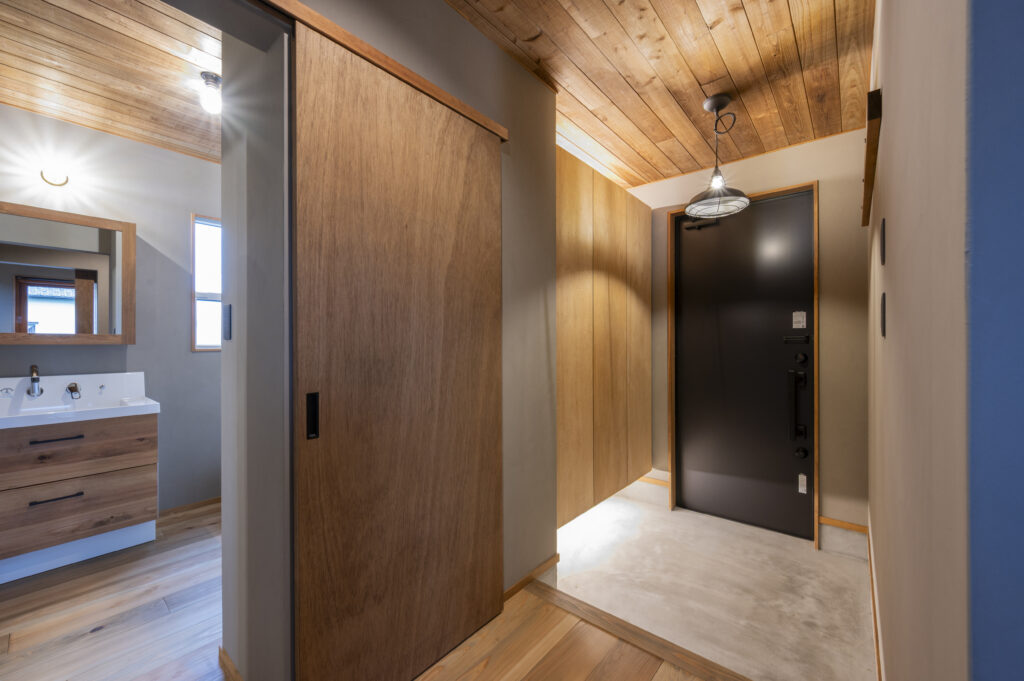 玄関に入るとすぐに、サンポクシダーのやわらかな天井が視線に広がります。 -
