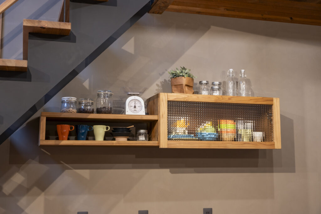 職人が丁寧に造り上げるキッチンのHWH造作吊り棚は、おうちに合ったお好きな物をオプションの中からお選びいただけます。 -