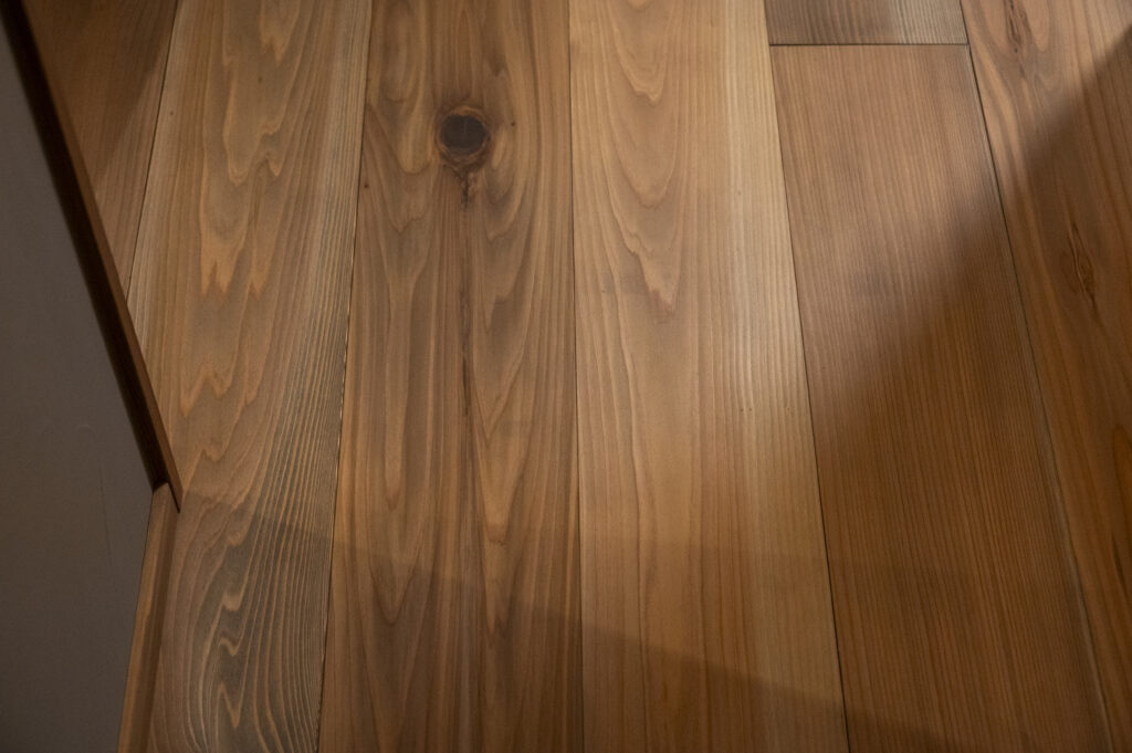 床の県産材サンポクシダーには、自社オリジナルの自然派オイルを、職人が手作業で丁寧に塗装しています。シダーは素足で歩くと柔らかい心地よさが魅力です。 -