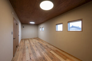 子供部屋は少し明るいト-ンの塗り壁に。将来は間仕切り壁を設けて、2部屋に分けられるようになっています。